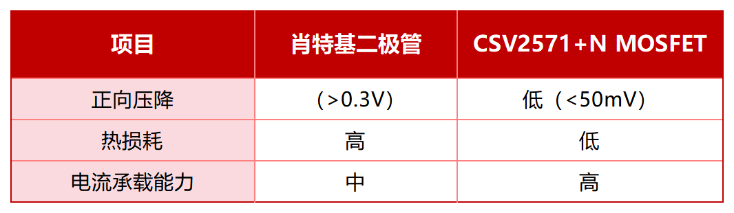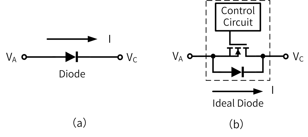 為了盡可能接近理想二極管的正向?qū)ǚ聪蚪刂构δ?,我們采用了一種模擬真實(shí)理想二極管行為的電路實(shí)現(xiàn),它通常由一個(gè)控制器芯片(如 CSV2571)配合一個(gè)外接N溝道 MOSFET構(gòu)成,如圖2(b)所示。其核心優(yōu)勢(shì)是: