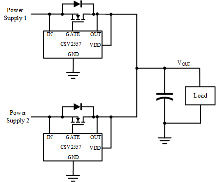 如圖9所示為CSV2557和外置MOSFET替代肖特基二極管的應(yīng)用原理圖。在ORing電源的應(yīng)用中,使用理想二極管方案可以提高系統(tǒng)效率,降低散熱設(shè)計(jì)難度以及減小系統(tǒng)體積。