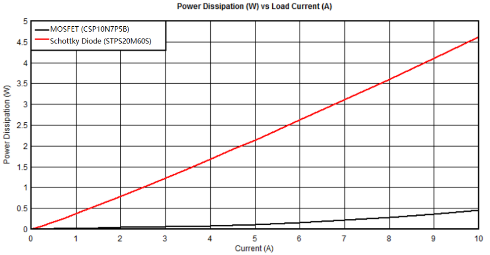 圖3顯示了肖特基二極管和理想二極管之間的功率耗散情況。當(dāng)負(fù)載電流為10A時(shí),理想二極管的功耗為0.35W,而肖特基二極管STPS20M60S的功耗為4.65W,因此理想二極管控制器和MOSFET配合使用時(shí)可將功耗降低到使用肖特基二極管時(shí)的1/10以下,非常符合如今節(jié)能減排的要求。