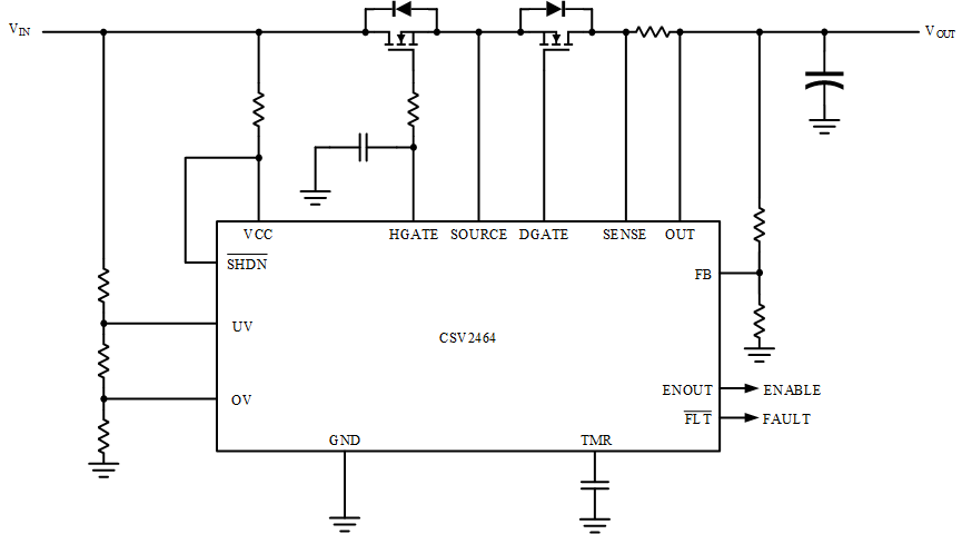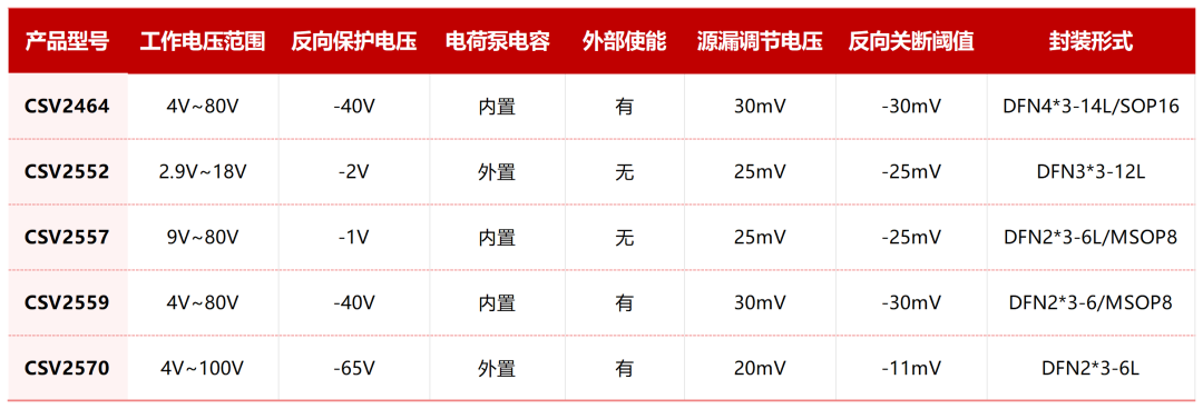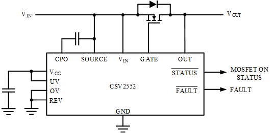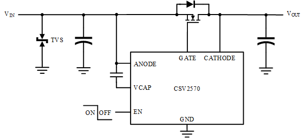 除CSV2557外,鍇威特提供了CSV2464、CSV2552、CSV2559、CSV2570等多種理想二極管控制芯片供用戶選擇。不同的芯片提供了輸入過壓保護(hù)、輸入欠壓保護(hù)、外置使能關(guān)斷功能、外置電荷泵以及浪涌抑制等多種功能,以滿足用戶的不同需求,實(shí)現(xiàn)更加靈活的配置。圖10到圖13分別給出了CSV2464、CSV2552、CSV2559、CSV2570的典型應(yīng)用原理圖。
