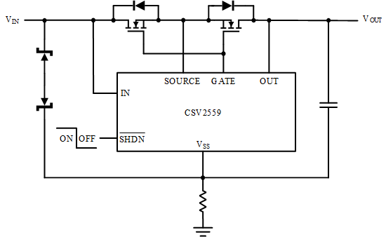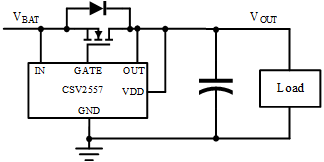 使用理想二極管替換肖特基二極管提供電池反向保護(hù),可以解決肖特基二極管所帶來的問題。圖7所示為CSV2557和外置MOSFET替代肖特基二極管的應(yīng)用原理圖。