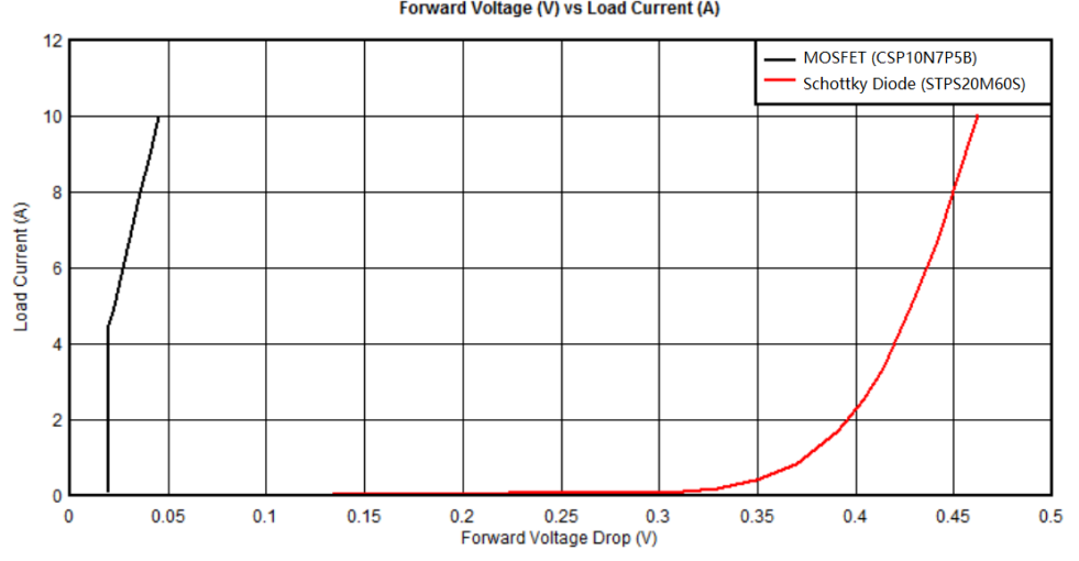 普通二極管的正向壓降為0.6V到0.7V,肖特基二極管的壓降為0.3V,肖特基二極管雖然正向壓降較低,但反向漏電流大。而理想二極管由低內(nèi)阻的MOSFET(例如2mΩ)構(gòu)成,當(dāng)MOSFET導(dǎo)通時(shí),可以實(shí)現(xiàn)極低的正向?qū)▔航?,如?fù)載電流為10A時(shí),其正向?qū)▔航禐?0mV,與肖特基二極管相比,導(dǎo)通損耗降低了95%以上,而且MOSFET的反向漏電流比肖特基二極管要小,也降低了反向狀態(tài)下的漏電損耗??梢悦黠@看出采用理想二極管的方案提供了更低的正向壓降,提高了電源系統(tǒng)的效率。圖2為理想二極管與肖特基二極管STPS20M60S的正向壓降對(duì)比。