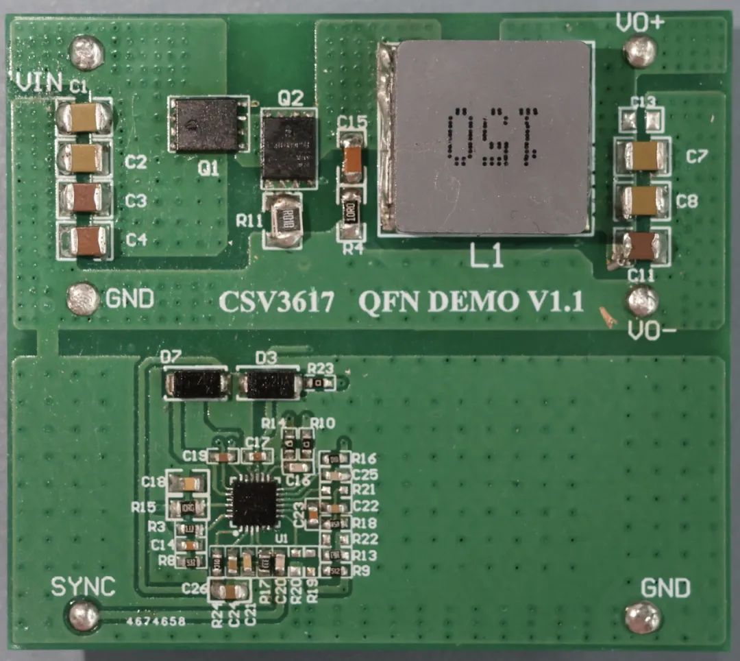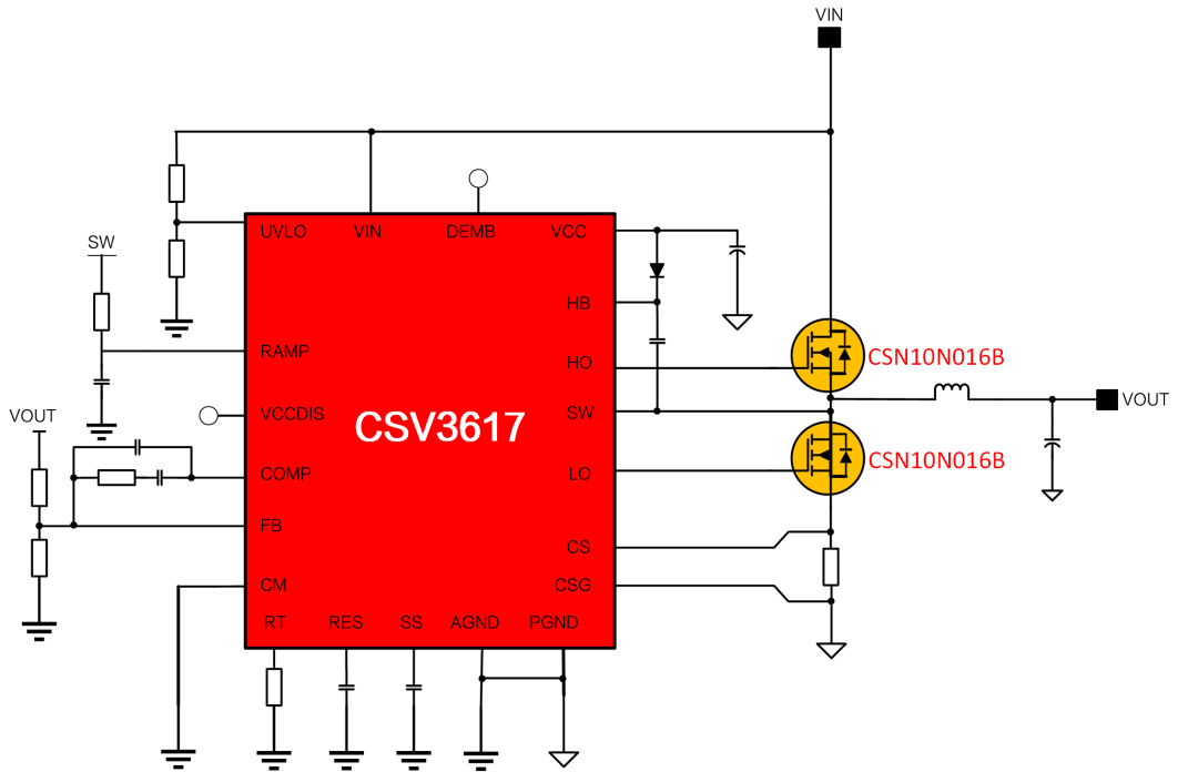 CSV3617采用自適應(yīng)死區(qū)時(shí)間控制來適配不同功率管,以提高工作效率。另外,用戶可選二極管仿真模式實(shí)現(xiàn)電感電流在輕載情況下的斷續(xù)模式,從而提高輕載工作效率。CSV3617還可以使用外部偏置電源給VCC供電,從而改變驅(qū)動電壓。通過管腳CM可提供平均輸出電流信息,幫助客戶監(jiān)測輸出電流。同時(shí),CSV3617還通過輸入欠壓,輸出過壓,輸出過流/短路,過溫等豐富的保護(hù)功能保障了芯片的高可靠性運(yùn)行。